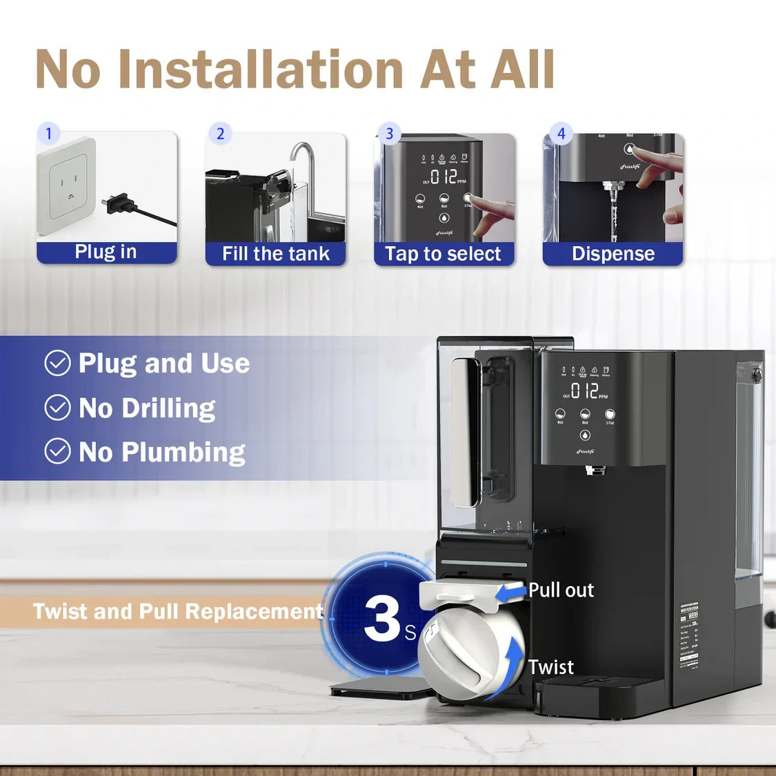 Tank RO filters store purified water in a separate tank, which can take up more space and may lead to secondary contamination. Frizzlife tankless RO filters produce water on demand without needing a storage tank, making them more compact and efficient.