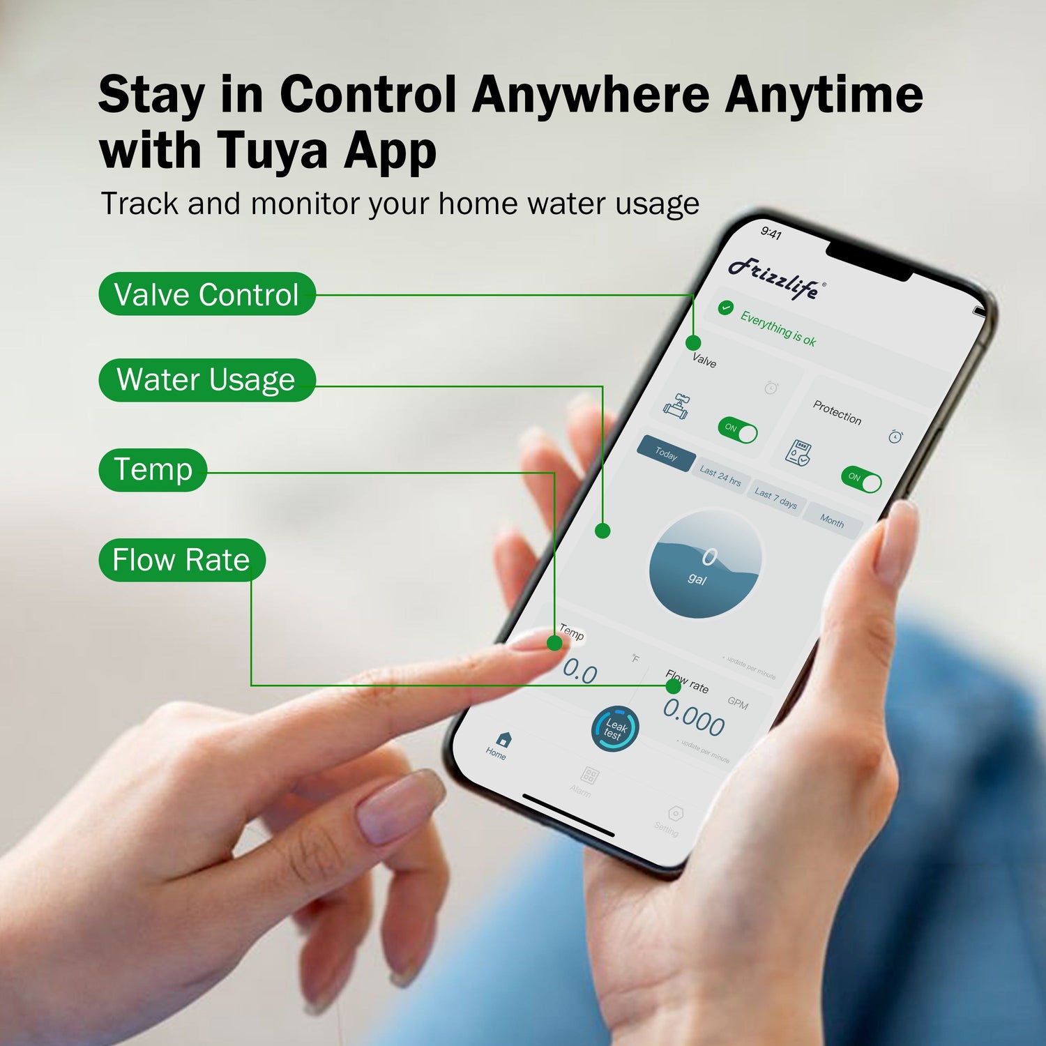 [APP-Based Control With Real-Time Water Usage]--Using the tuya “smart life” app, you can control the frizzlife valve remotely and access real-time insights on water usage, including flow rate, temperature, and pressure. enjoy worry-free monitoring, even while on vacation, at work, or on the go.